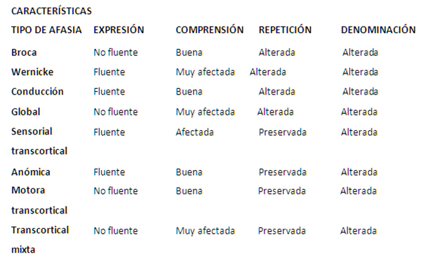 Existen múltiples clasificaciones en las que se describen los diferentes tipos de afasia. La mayoría de ellas coinciden en utilizar cuatro parámetros que diferencian un tipo de afasia de otro: expresión, comprensión, repetición y denominación. En la tabla 1, elaborada en base a los datos de Peña-Casanova y Barraquer-Bordas4 (1983), se destacan las características fundamentales en cada tipo de afasia.