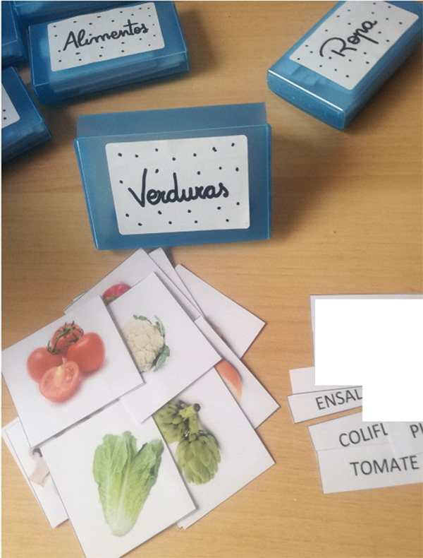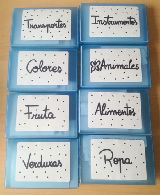 En esta actividad se presentan seis imágenes de cada campo semántico que se quiera trabajar en ese momento. Normalmente solo se hace con vocabulario de dos campos semánticos diferentes. A continuación, se le da de forma oral el nombre de una categoría para que señale las imágenes que pertenecen a dicha categoría. Una vez que los señala, se les da el nombre de esos objetos.