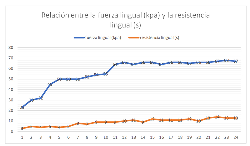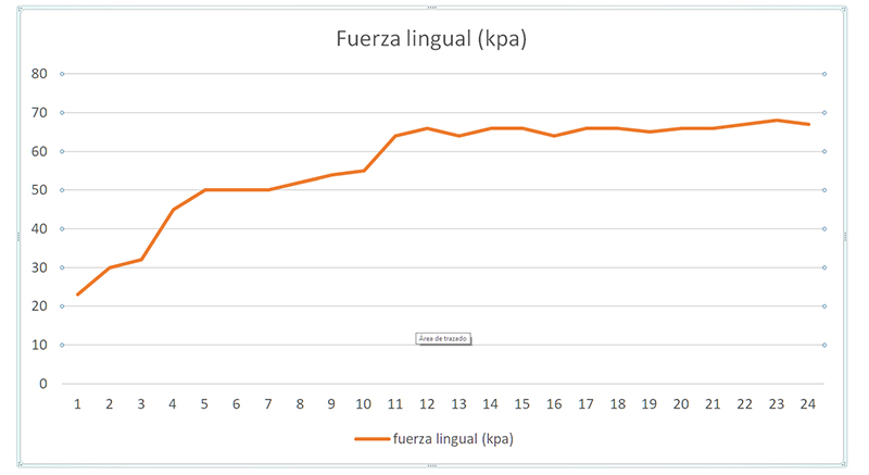 Así, se espera que, tras el entrenamiento realizado durante la intervención, se observe un aumento progresivo de la fuerza lingual a lo largo del tiempo, lo que correlacionaría con una mejora en la capacidad de los músculos linguales para generar fuerza durante la deglución.