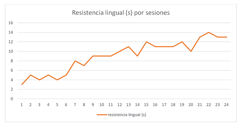 Con relación a la resistencia lingual, y de manera similar a lo previsto para la evaluación de la fuerza, se espera observar una tendencia creciente a medida que la paciente adquiera más experiencia y continúe con las sesiones de intervención logopédica. Si esto se lograra, indicaría que la paciente ha conseguido mejorar su capacidad para mantener la fuerza lingual durante periodos de tiempo más prolongados, rasgo que resulta esencial para una deglución eficiente y segura.