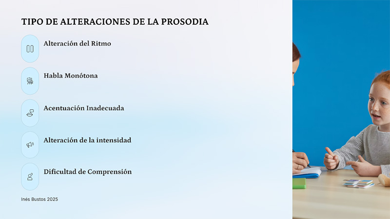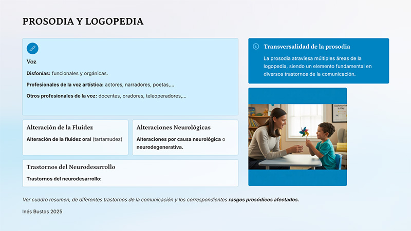 La prosodia, -que incluye, la altura, la intensidad, la velocidad del habla y las pausas,- es fundamental para lograr una comunicación efectiva. Su aplicación se extiende a las alteraciones del habla, la voz y el lenguaje. Por lo tanto, la prosodia es un elemento transversal en el ámbito de la intervención logopédica; contribuye a mejorar la expresión oral, a desarrollar habilidades comunicativas, y a expresar emociones de manera asertiva.