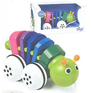 Cuando el bebé ya empieza a caminar y adquiere mayor autonomía. El arrastre es un excelente medio con el cual desarrolla su motricidad y coordinación. Al estirar la cuerda, el gusanito se mueve emitiendo un sonido rítmico de Click-Clack, estimulando al bebé a seguir estirando.
