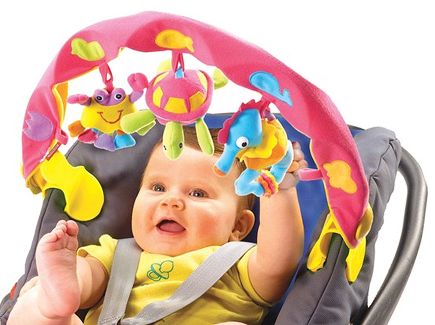 Este arco de actividades con ángulo ajustable y lazos adicionales para agregar otros muñecos se adapta a la mayoría de coches y sillas de paseo. Una suave tortuga musical, un sonajero en forma de caballito de mar y un cangrejo colorido sonajero con tres alegres melodías mantendrán al bebé entretenido mientras estimula su desarrollo visual y sus habilidades motoras y cognitivas.