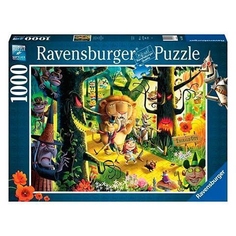 Puzle de 1000 piezas con ilustración de Dan MacAdam que representa con personajes expresivos y exagerados una escena de la clásica película de 1939 "El Mago de Oz".