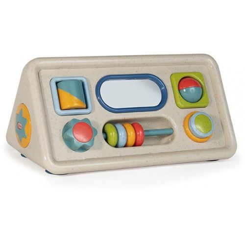 Este centro de actividades de doble cara estimula los sentidos primarios de los niños/as. Gira el tambor, haz girar la flor que hace clic, presiona el chirriador y rota la bola que suena.